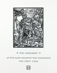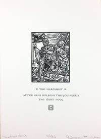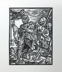 This image is one in a series of 82 Dance of Death images that I'm engraving into endgrain wood and printing along with moveable type. Forty-one of the images are from Han Holbein the Younger's 1538 series that was originally carved by the formschneider Hans Lützelburger. The remaining forty-one prints in the series will all be made from my own original drawings. The combination of old and new prints in the series reflect how much changes through time with the exception of this one equalizing truth.